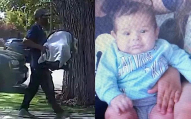 Em bé 3 tháng tuổi lúc này đang mặc chiếc áo dài tay màu trắng in hình con khủng long. Cảnh sát công bố đoạn camera giám sát cho thấy kẻ đột nhập đi xuống vỉa hè ôm một chiếc nôi màu đen được che phủ bởi tấm chăn trắng.