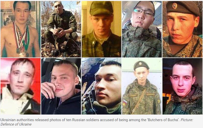 Hàng trăm nhân viên hành pháp của Ukraine đã dành nhiều tuần để xác định những người lính Nga đã khủng bố Bucha trong tháng 3, khi lực lượng Nga chiếm đóng thị trấn và ít nhất 400 thường dân thiệt mạng. Các công tố viên tuyên bố họ vừa công bố hình ảnh của 10 binh sĩ Nga mà họ tin rằng có liên quan đến các nhân chứng và nạn nhân – để đối chiếu nhân dạng.