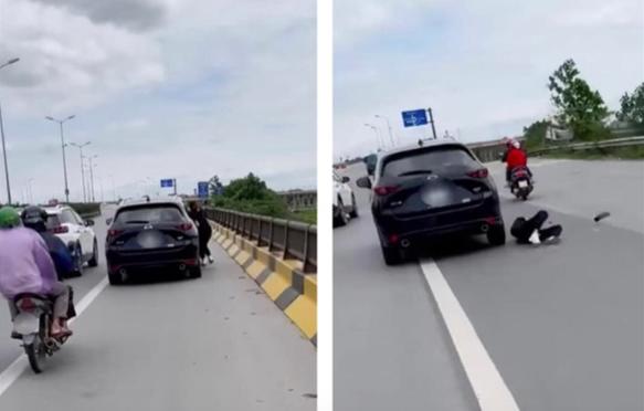 Hình ảnh người phụ nữ cố đu vào xe ôtô và bị ngã xuống đường khi chiếc xe đánh lái, phóng nhanh - Ảnh cắt từ clip.