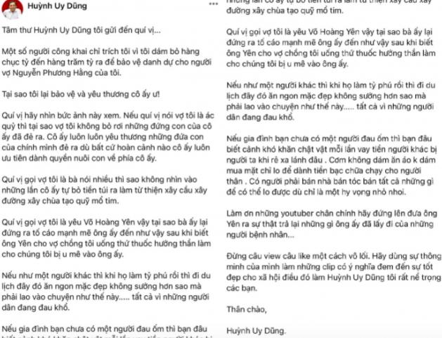 Sau con trai út, ông Huỳnh Uy Dũng (Dũng Lò Vôi) là đối tượng tiếp theo bị nhiều kẻ xấu “nhòm ngó”, lợi dụng tên tuổi. Mới đây, dân tình lan truyền bức tâm thư được chia sẻ trên trang fanpage H uỳnh Uy Dũng có hơn 675.000 lượt theo dõi với nội dung kêu oan cho bà Nguyễn Phương Hằng.