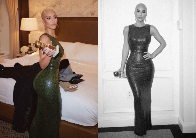 Hôm 6/5, Kim Kardashian đăng ảnh trên trang cá nhân, tiết lộ ngoài bộ đầm thảm đỏ, cô còn diện một thiết kế khác của biểu tượng nhan sắc Mỹ. Chiếc váy sequins màu xanh lá đậm do Norman Norell thực hiện được Marilyn Monroe mặc tại Quả Cầu Vàng 1962.