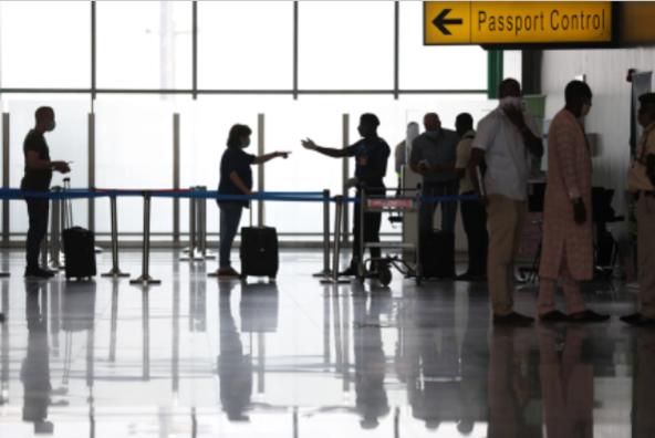 Hành khách xếp hàng tại một cổng lên máy bay tại sân bay quốc tế Nnamdi Azikiwe tại Abuja, Nigeria. Ảnh: AFP.
