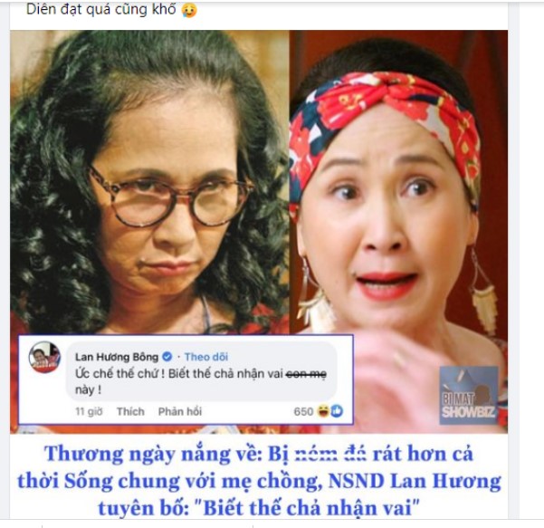 Mới đây, sau khi tiếp tục bị nhiều công đồng mạng chỉ trích quá đáng về vai diễn bà Hiền, NSND Lan Hương đã tuyên bố cứng về điều này. Cụ thể, dưới phần bình luận của bài đăng do một thành viên ekip phim đoàn làm phim đăng tải, NSND Lan Hương tuyên bố: "Ức chế thế chứ! Biết thế chả nhận vai con mẹ này".