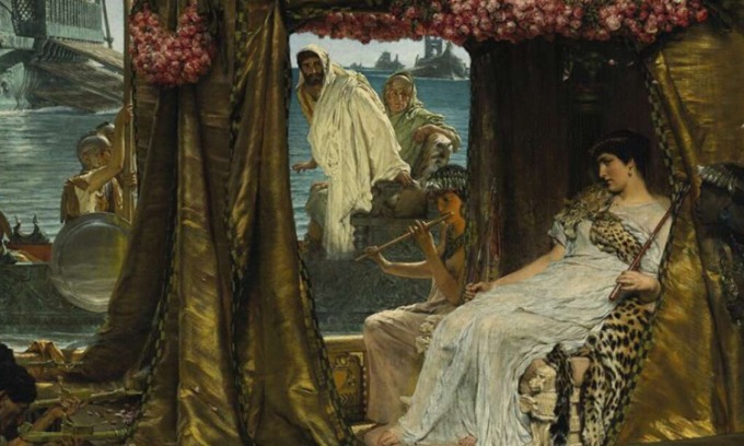 Minh họa cảnh nữ hoàng Cleopatra gặp gỡ chính trị gia La Mã Marcus Antonius. Ảnh: Lawrence Alma-Tadema