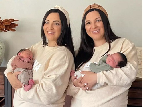 Hai chị em sinh đôi giống hệt nhau Jill Justiniani và Erin Cheplak đều sinh con trai vào ngày 5/5, các bé cùng cân nặng và chiều dài.