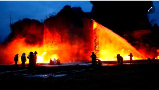 Lực lượng cứu hộ tại khu vực kho chứa nhiên liệu bị trúng tên lửa hành trình ở Lviv vào tháng 3. Ảnh: Reuters.