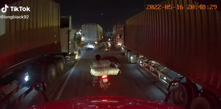 Khi ấy có 1 tài xế xe máy chở hàng cồng kềnh phía sau chờ mãi vẫn chưa qua được đường. Rất nhanh chóng, tài xế xe container có camera hành trình đã dừng xe, ra hiệu cho tài xế xe container bên cạnh nhường đường cho xe máy. Tiếp đó anh chạy tới phụ giúp đẩy chiếc xe máy sang làn bên kia.