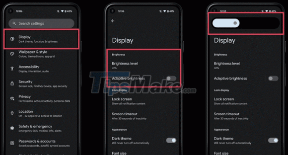 Vào Cài đặt -> Hiển thị -> Độ sáng, sau đó tùy chỉnh độ sáng cho phù hợp.