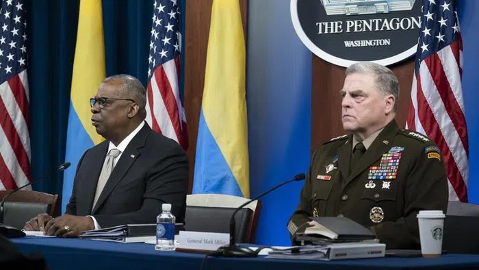 Bộ trưởng Quốc phòng Mỹ Lloyd Austin và Chủ tịch Hội đồng Tham mưu trưởng Liên quân Mark Milley hôm 23/5 đã gặp gỡ lãnh đạo các nước đồng minh để thảo luận về việc tăng cường viện trợ vũ khí cho Kiev. Trong cuộc họp này, hai ông Austin và Milley đã ngồi trước bốn lá quốc kỳ Ukraine bị treo ngược.