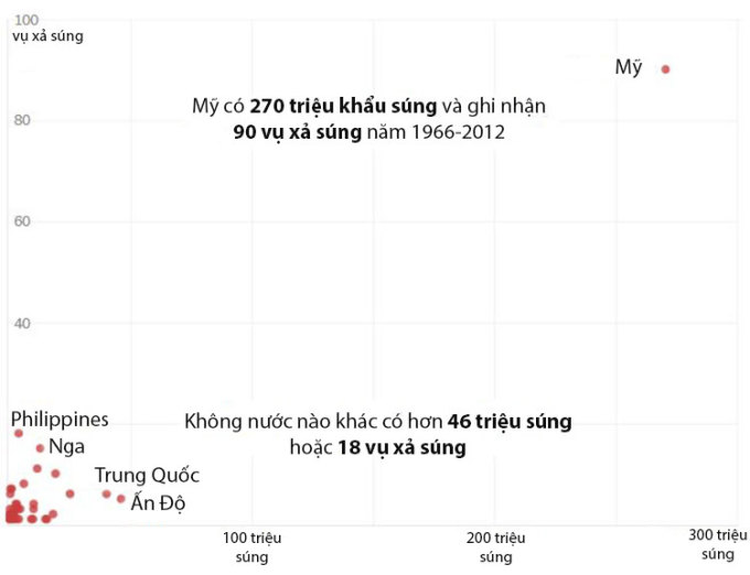 Số súng và vụ xả súng tại Mỹ cùng các nước khác trong giai đoạn 1966-2012. Đồ họa: NY Times.