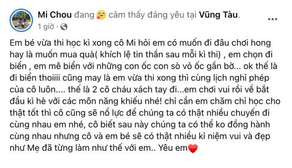 “Em bé vừa thi học kì xong, cô Mi hỏi em có muốn đi đâu chơi không hay là muốn mua quà (khích lệ tinh thần sau mỗi kì thi), em chọn đi biển, em mê biển với những con ốc con sò vỏ ốc gần bờ… Ok thế là đi biển thôi, cũng may là em vừa thi xong thì cùng lịch nghỉ phép của cô luôn…. Thế là 2 cô cháu xách tay đi… Em chơi vui rồi về bắt đầu kì hè với các môn năng khiếu nhé! Chỉ cần em chăm chỉ học cho thật tốt thì cô cũng sẽ nổ lực để chúng ta có thật nhiều chuyến đi cùng nhau em nhé, cô biết sau này chúng ta có thể không đồng hành cùng nhau nhưng cô và em bé sẽ có thật nhiều kỉ niệm vui và đẹp như mẹ đã từng làm như thế với em. Yêu em”.
