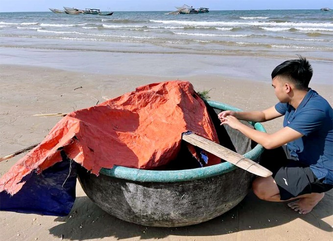 Chiều 30/5, chiếc thuyền thúng được trùm tấm bạt cỡ lớn đươc đặt bên bờ biển xã Yên Hòa, huyện Cẩm Xuyên.