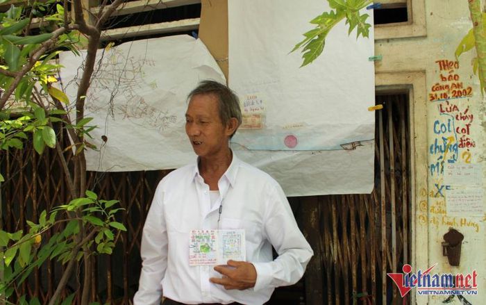 Ông Trương Lâm đứng trước căn nhà với những tờ giấy ghi, vẽ nhiều thông tin khó hiểu.