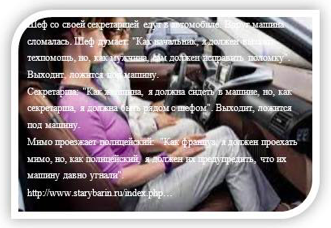 Sếp và cô thư ký đi chung xe. Thình lình xe bị hỏng. Sếp nghĩ: “Mình là sếp, đáng lý ra mình nên gọi xe cứu hộ, nhưng là đàn ông nên mình phải tự sửa thôi”, nghĩ rồi bước xuống, chui xuống gầm xe.