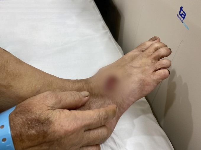 Khoảng hai tháng trước, mu bàn chân của bà Nguyễn Thị Hiền (63 tuổi, ở Bình Dương) xuất hiện vết mụn nhọt. Bà nặn mủ và rửa mụn nhọt bằng nước lá trầu, đắp các loại lá dân gian nhưng vẫn không khỏi. Vết thương mỗi ngày lan ra khiến bà bị sốt cao, khó thở... Tình trạng sốt, khó thở mỗi ngày một tăng, bà được người nhà đưa đến khoa Cấp cứu, Bệnh viện Đa khoa Tâm Anh TP HCM.