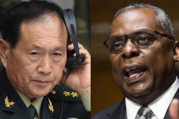 Bộ trưởng Quốc phòng Trung Quốc Ngụy Phượng Hòa (trái) và người đồng cấp Mỹ Lloyd Austin. Ảnh: AP