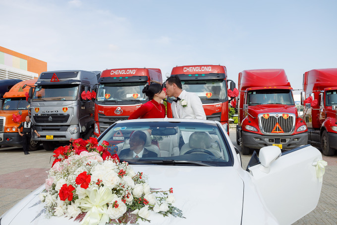 Sáng ngày cưới, chú rể lái chiếc xe mui trần đi trước, theo sau là đoàn đầu kéo container do các lái xe nhà cầm lái, vượt 80 km từ Trà Vinh đến huyện Ba Tri, Bến Tre đón dâu. "Tôi dặn anh em chạy thành một hàng dọc để không gây ách tắc quốc lộ", chú rể nói.