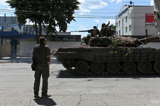 Binh sĩ Ukraine quan sát xe tăng của quân đội nước này di chuyển trên đường phố Lysychansk ngày 19/6. Ảnh: Reuters.