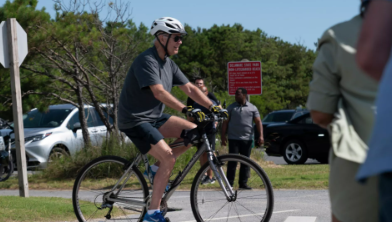 Tổng thống Biden đi cùng một nhóm người và được các phóng viên săn đón, ông chạy xe đến chỗ họ rồi ngã lăn sang một bên cùng với chiếc xe.