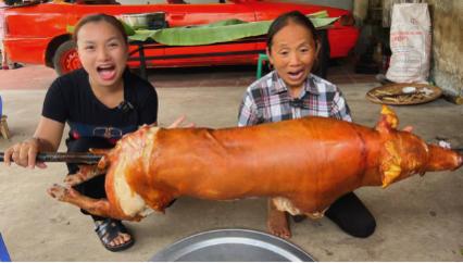 Trong cuộc gặp gỡ lần này, bà Tân đã làm hẳn một con heo quay siêu to khổng lồ để đãi mẹ con Quỳnh Trần và mọi người đi cùng. Quỳnh Trần đã được tham gia bữa ăn siêu to khổng lồ quen thuộc thường xuất hiện trong các clip của bà Tân.