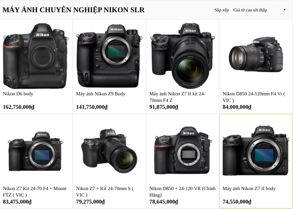 Một số mẫu máy ảnh SLR của Nikion đang được niêm yết trên một cửa hàng tại Việt Nam