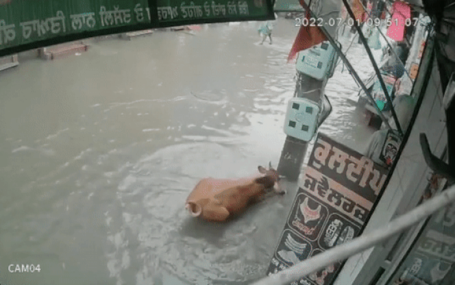Theo như vào khoảng 9h sáng 1/7 vừa qua, bên ngoài một cửa hàng trang sức ở Mansa, Ấn Độ. Lúc này, một con bò đang đi trên con đường ngập nước thì bất ngờ bị hút vào một cột điện ngập nước khiến con vật co giật, loạng choạng ngã lăn xuống đất.