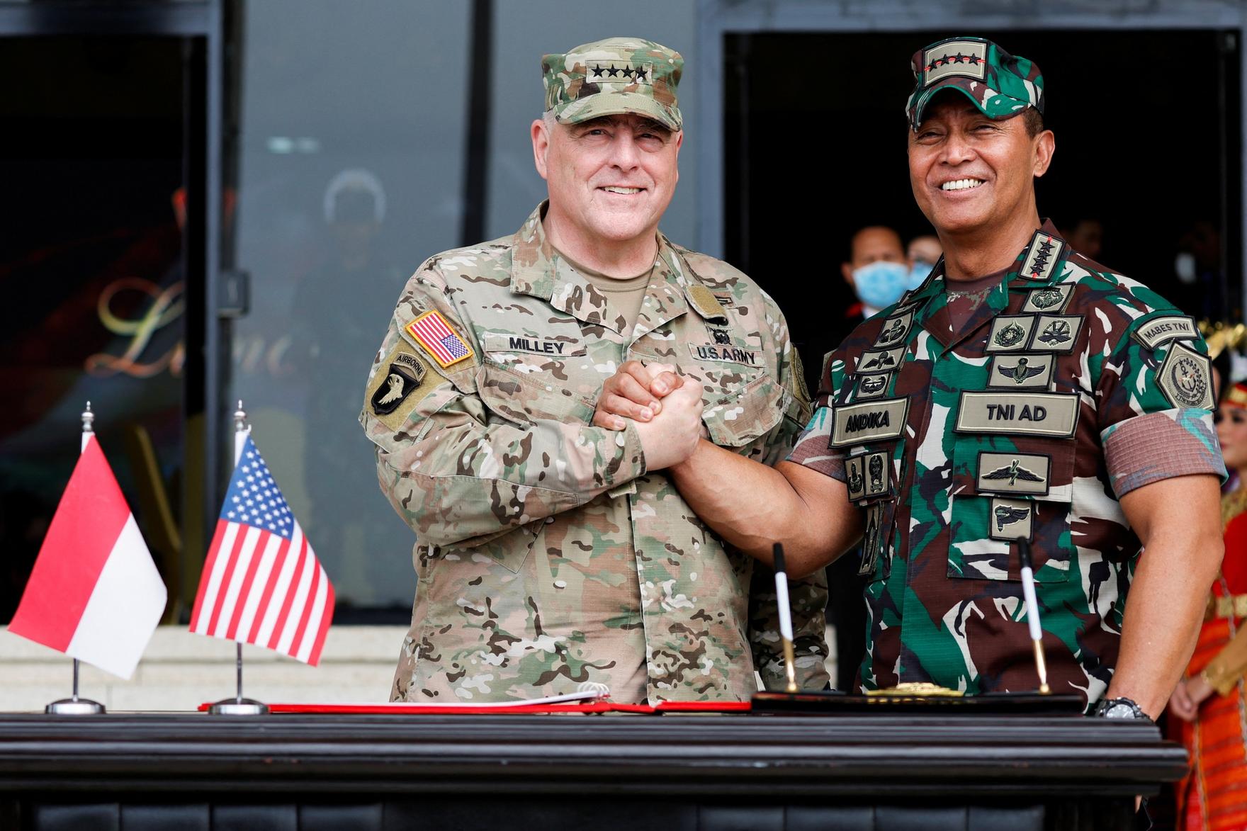 Tư lệnh Lực lượng vũ trang Indonesia Andika Perkasa (phải) tiếp Chủ tịch Hội đồng tham mưu trưởng liên quân Mỹ Mark Milley tại Jakarta ngày 24.7