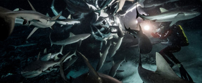 Vào một đêm gần như không có trăng ở Fakarava, các thành viên trong nhóm của nhiếp ảnh gia Laurent Ballesta bơi ngược dòng thủy triều, chiếu đèn để chụp ảnh cá mập khi chúng săn mồi