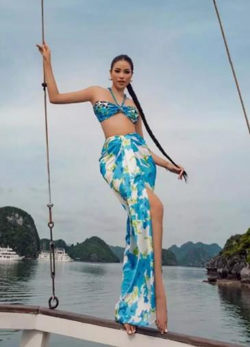 Tiếp theo, người đẹp đổi sang bộ váy màu xanh mang cảm giác tươi mát.. Nhìn phần eo săn chắc, nuột nà của Phạm Hương, không ai nghĩ cô đã là bà mẹ hai con. Điểm nhấn của outfit chính là đôi khuyên tai ngọc trai to bản.