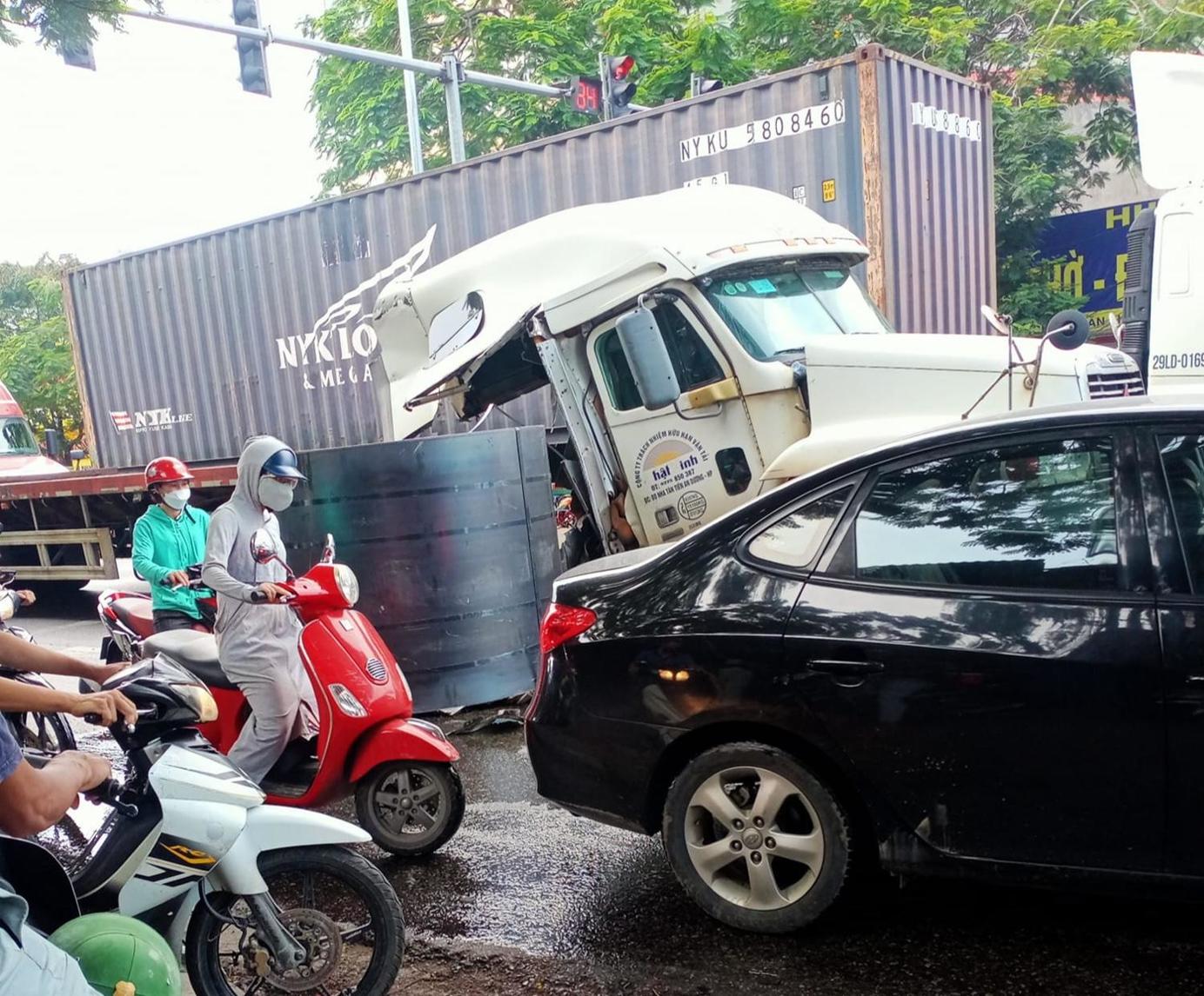 Chiếc xe container chở theo cuộn thép nặng hàng chục tấn. Khi dừng đén đỏ, dây xích giằng bất ngờ bị đứt khiến cuộn thép lăn về phía trước, đè bẹp cabin, tài xế may mắn thoát chết.