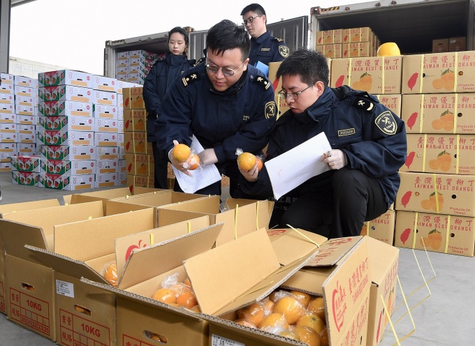 Các nhân viên hải quan kiểm tra trái cây nhập khẩu từ Đài Loan tại một cảng ở tỉnh Phúc Kiến, đông nam Trung Quốc, ngày 21/1/2019. Ảnh: AFP.