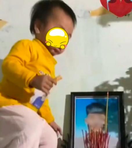 Đoạn clip ghi lại cảnh em bé đang đứng trên bàn thờ của bố như một việc làm quen thuộc. Theo lời chia sẻ của chủ tài khoản, mỗi ngày em vẫn thường hay kê ghế để trèo lên đây "chơi" với bố của mình.