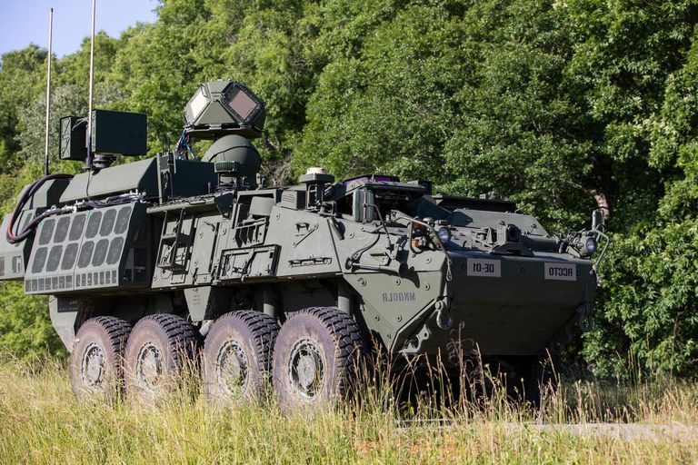 Mỹ đang chuẩn bị đưa vào trang bị một phiên bản xe chiến đấu bộ binh Stryker với tia laser phòng không có khả năng bắn hạ đạn cối khi đang bay. Ảnh: Quân đội Mỹ