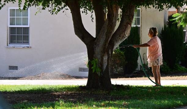 Một phụ nữ đang tưới cỏ tại Alhambra, Nam California hôm thứ Ba, 16 ngày 8, 2022. Vì hạn hán do thiếu mưa và nhiệt độ nóng trong năm nay, chính quyền kêu gọi người dân hãy tiết kiệm nước cũng như điện. (Frederic J. Brown/ AFP via Getty Images)
