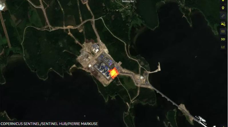 Hình ảnh vệ tinh chụp lại nguồn bức xạ nhiệt tỏa ra từ việc đốt khí đốt tại nhà máy Portovaya. Ảnh: BBC