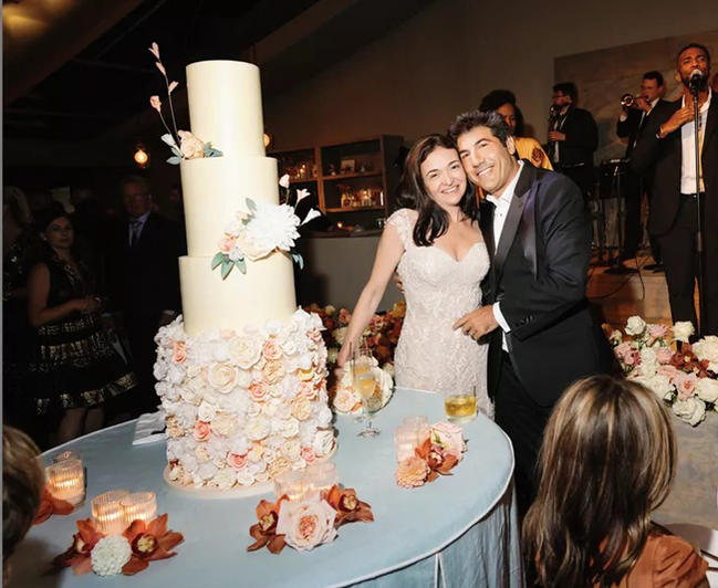 Nữ tỷ phú Sheryl Sandberg đặt bánh cưới bốn tầng từ đầu bếp nổi tiếng Duff Goldman và mất 26 giờ vận chuyển đến tiệc cưới.