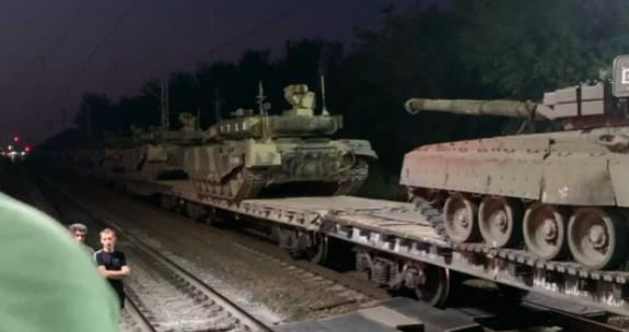T-80BV và T-90M của Quân đoàn 3 Liên bang Nga được cho là đang được vận chuyển đến biên giới Ukraine bằng đường sắt. Ảnh Defence.