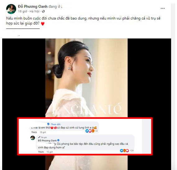 Theo đó, nữ diễn viên cho rằng việc gặp sóng gió tình ái là do ‘hậu tam tai’ và vô cùng lạc quan khi với cô biến cố này. Trong 1 bình luận, Phương Oanh cũng thể hiện thái độ 'ngẩng cao đầu' của mình giữa ồn ào: "Dù phong ba bão táp đến đâu cũng phải ngẩng cao đầu và xinh đẹp đúng không ạ?"