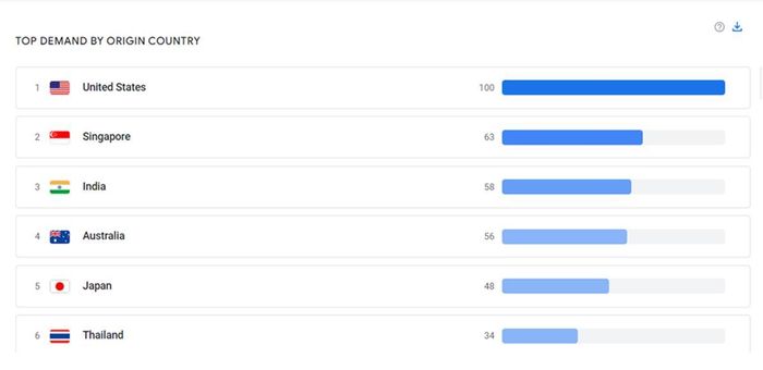 Top 10 quốc gia tìm kiếm nhiều nhất về du lịch Việt Nam lần lượt là: Mỹ, Singapore, Ấn Độ, Úc, Nhật Bản, Thái Lan, Đức, Pháp, Anh, Malaysia. Nguồn: Google Destination Insights