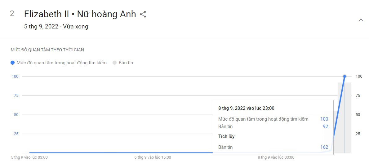 Kể từ nửa đêm ngày 8/9 (giờ Việt Nam), mức độ quan tâm trong hoạt động tìm kiếm về chủ đề Nữ hoàng Anh Elizabeth II đạt thang điểm 100/100. Số lượng bản tin về chủ đề này cũng tăng vọt với hơn 160 bản tin trên khắp các mặt báo.