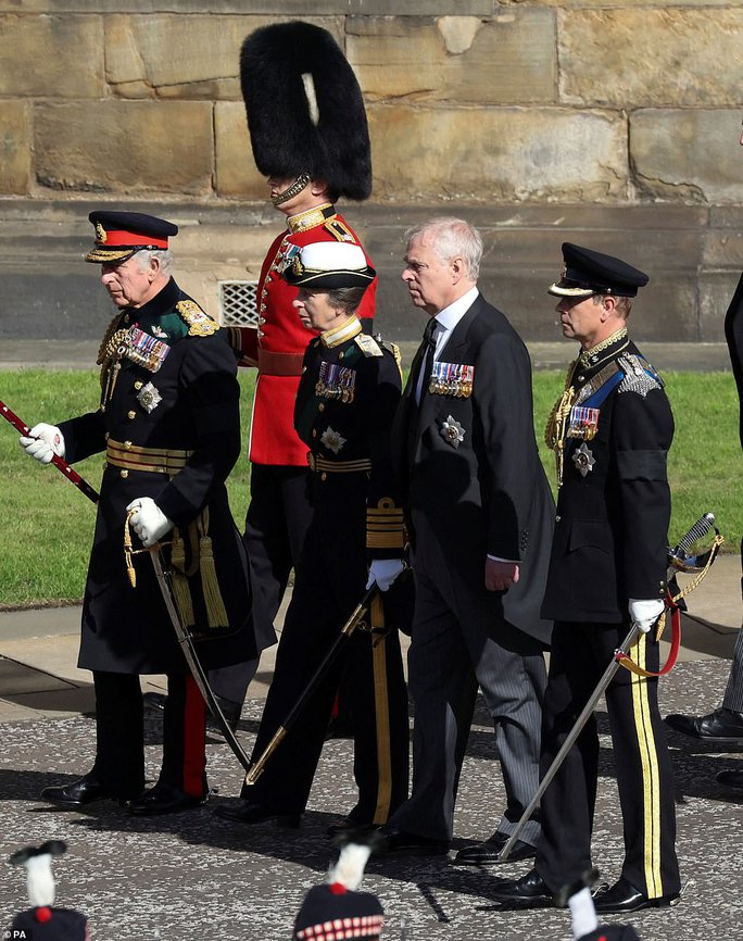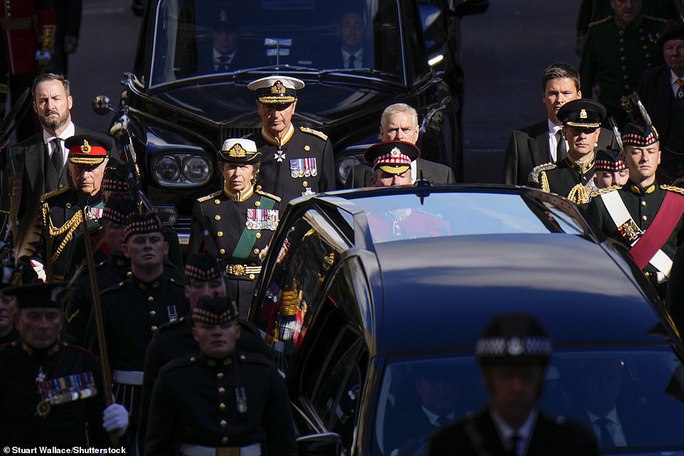 Vua Charles III, Công chúa Anne, Hoàng tử Andrew và Hoàng tử Edward theo sau chiếc xe tang. Ảnh: PA