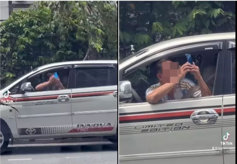 Lúc mới chạy xe ra khỏi hầm tự nhiên thấy người này giơ điện thoại lên quay theo mình, mình dừng xe và cũng giơ điện thoại lên quay ngược lại thì người này giả vờ quay lên tòa nhà.
