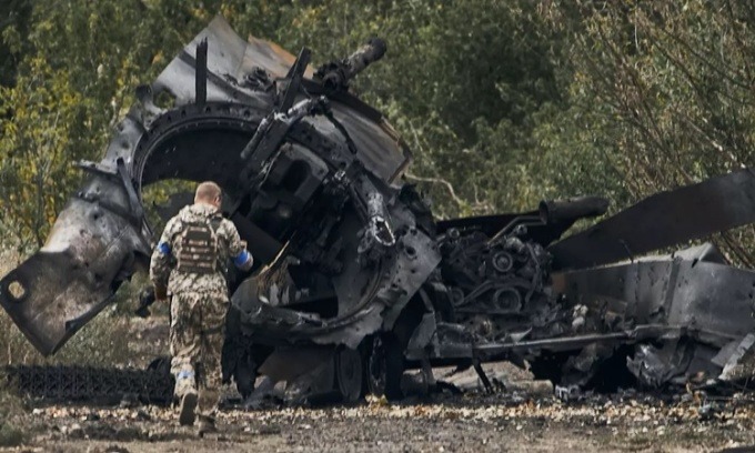 Binh sĩ Ukraine đi ngang qua một chiếc xe tăng Nga bị hư hại tại khu vực vừa được giải phóng ở Kharkov ngày 11/9. Ảnh: AP.