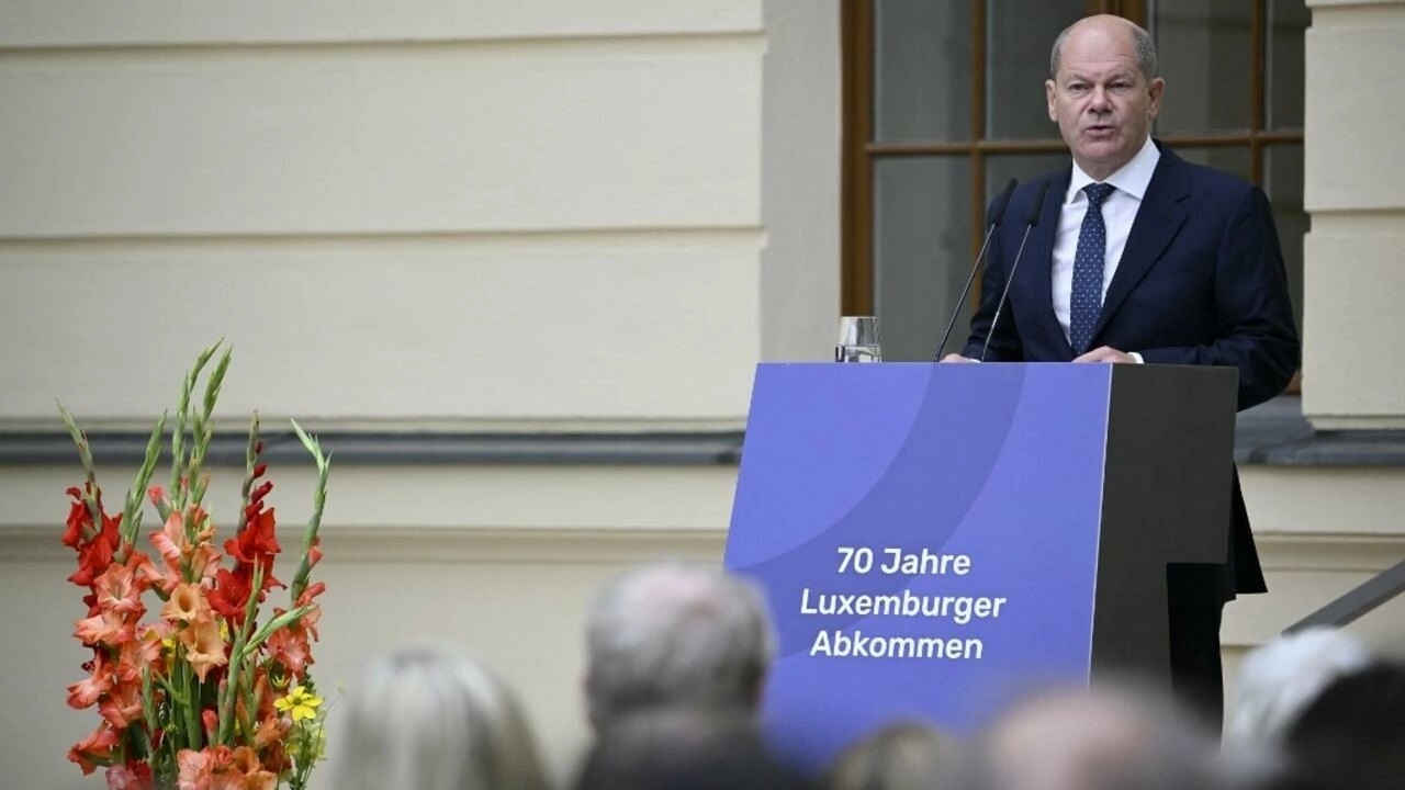 Thủ tướng Đức Olaf Scholz trong lễ kỷ niệm 70 năm ngày ký thỏa thuận đầu tiên bồi thường cho các nạn nhân diệt chủng Do Thái dưới thời phát xít. Ảnh chụp ngày 15/09/2022. AFP - TOBIAS SCHWARZ
