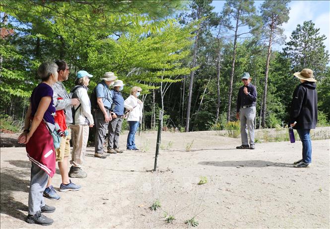 Tiến sĩ Đặng Trung Phước hướng dẫn du khách tham quan đồi cát Pinhey. Ảnh: Trung Dũng/PV TTXVN tại Canada