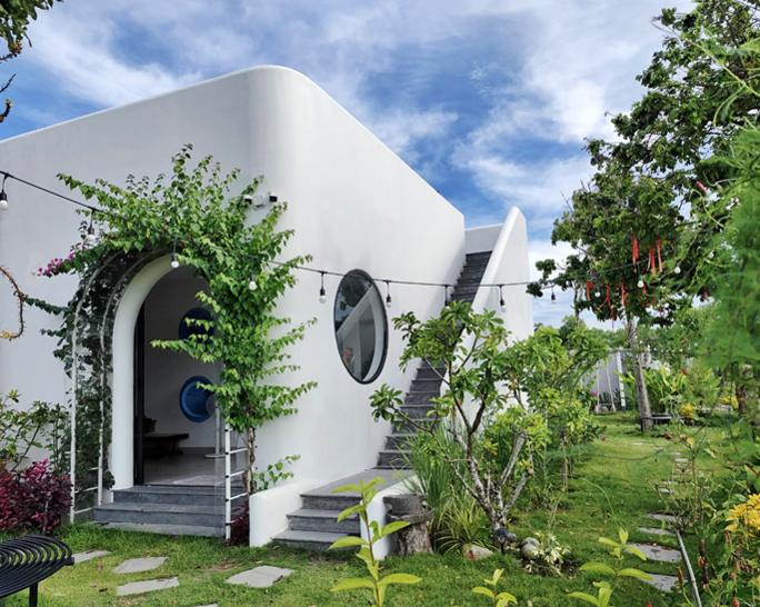 Với kiến trúc tương phản với nhà thờ cổ của gia tộc bên cạnh, anh Truyền thiết kế ngôi nhà trú bão với màu trắng là chủ đạo, bo tròn các góc cạnh, mô phỏng hình tượng một boong tàu vững chãi.