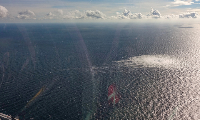 Bong bóng khí rò rỉ từ đường ống Nord Stream 2 nổi lên bề mặt biển Baltic, gần đảo Bornholm của Đan Mạch ngày 27/9. Ảnh: BQP Đan Mạch.