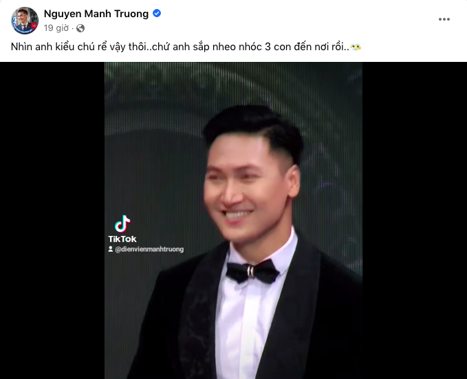 Tuy nhiên, dù khoe vẻ điển trai ở tuổi U40 nhưng Mạnh Trường phải ngậm ngùi thừa nhận rằng: "Nhìn anh kiểu chú rể vậy thôi, chứ anh sắp nheo nhóc 3 con đến nơi rồi".