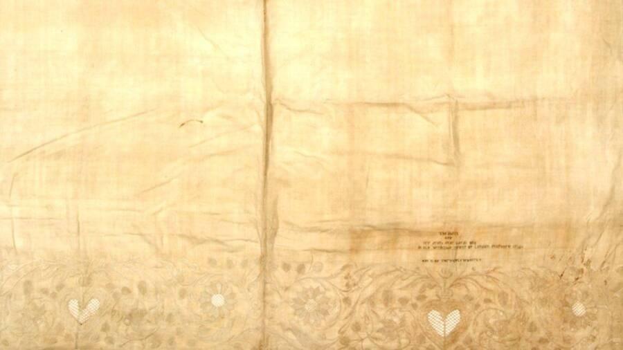 Bảo tàng London trưng bày tấm vải với ghi ghú về nội dung của tấm vải, nội dung: “Tấm ga trải giường của Lord’s thân yêu của tôi trong Tháp London khốn khổ tháng 2 năm 1716 x Ann C of Darwent = Waters”.
