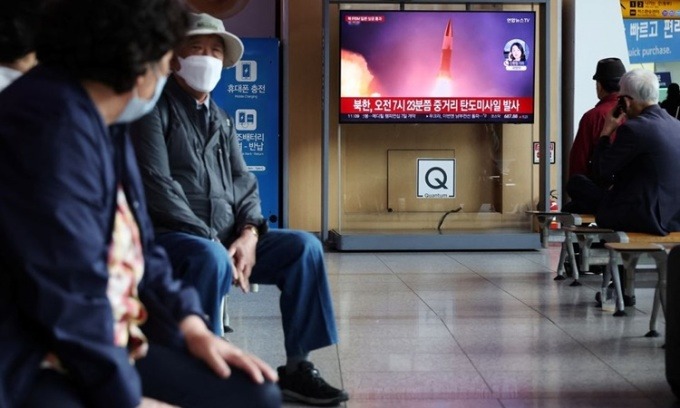 Người dân tại một nhà ga ở Seoul, Hàn Quốc, theo dõi bản tin về việc Triều Tiên phóng tên lửa đạn đạo qua Nhật Bản ngày 4/10. Ảnh: Reuters.